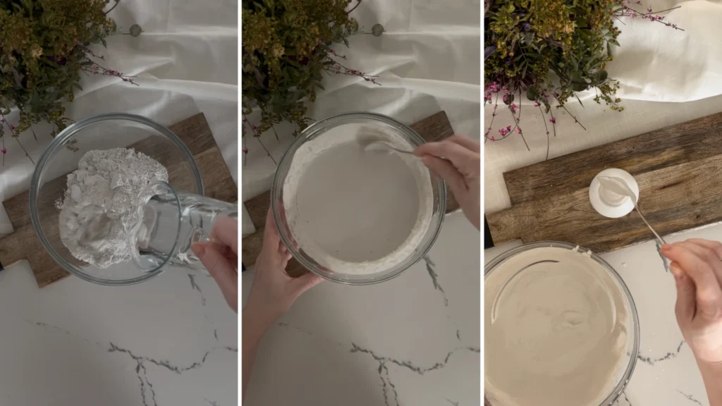 Keverd össze a Raysin öntőport a vízzel, a gyártó ajánlása szerint. Fontos, hogy ne keverd túl gyorsan. Ha túl intenzíven dolgozol, levegőt viszel bele, és buborékos lesz a felület. Én inkább lassan, türelmesen keverem, amíg krémes állagot nem kapok.