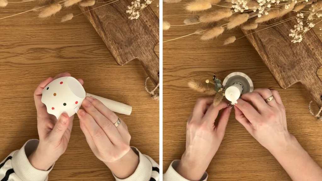 A gyertyatartó önmagában is megállja a helyét, de én szeretem kiegészíteni néhány természetes elemmel. Száraz virágokkal, apró ágakkal, nyuszifüllel vagy pampafűvel.