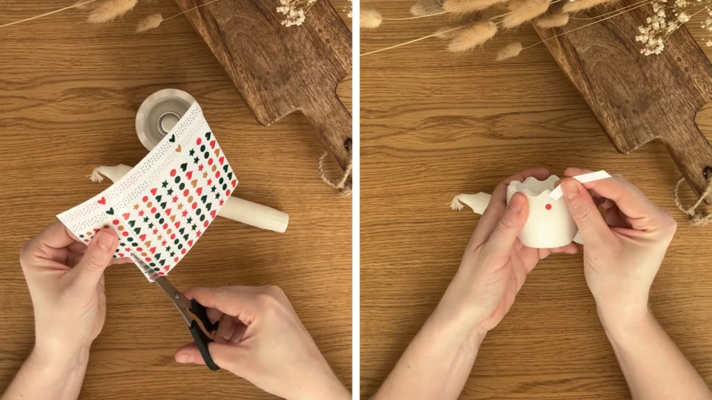 A tojás gyertyatartónál most apró, színes pöttyöket választottam. Ettől játékos lett, de még mindig letisztult maradt. Egy finom felirat, például „Vidám Húsvétot”, szintén jól működik, ha nem túl nagy méretben kerül rá.
