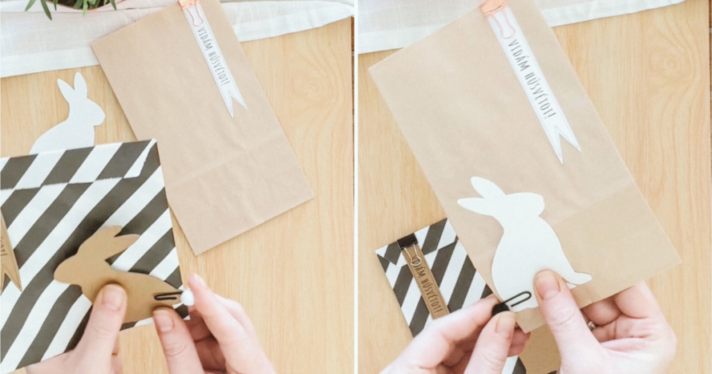 A végén pedig vágok ki két nyuszi formát és feltűzöm a gémkapoccsal a csomagra.