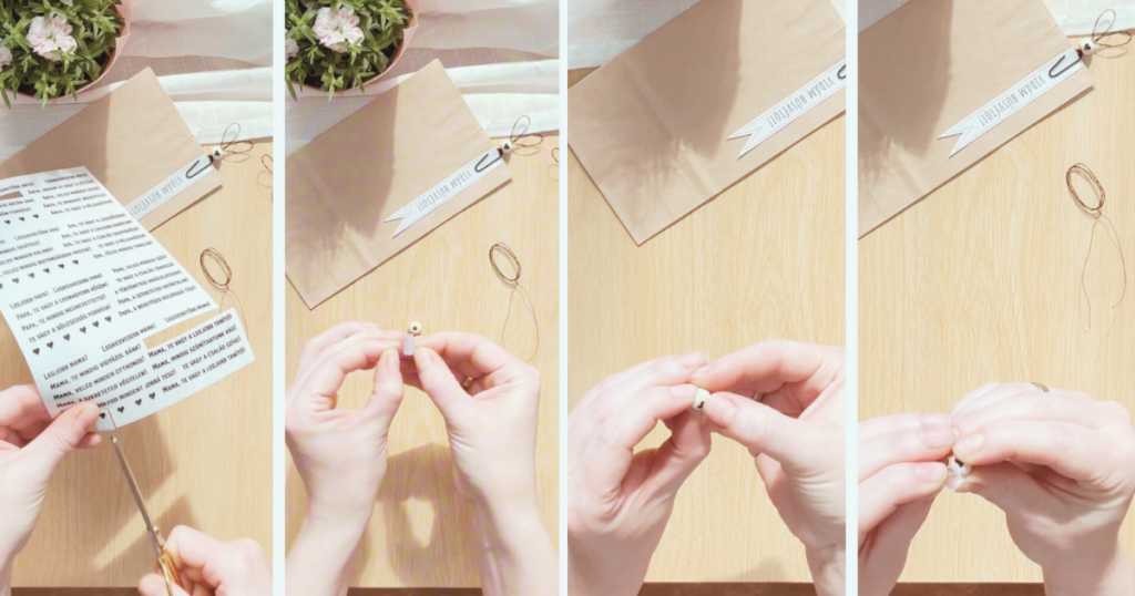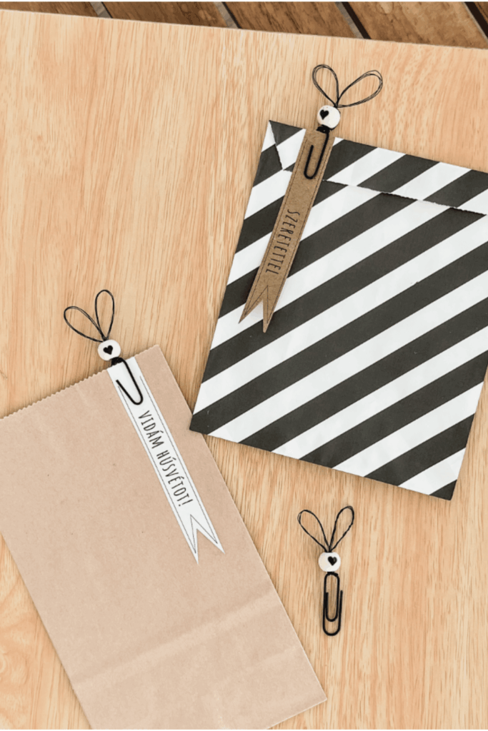 Én leggyakrabban kraft papírzacskóra csíptetem. A tetejére egy egyszerű, zászló alakú papírcímkét teszek, az alkalomhoz illő felirattal.
