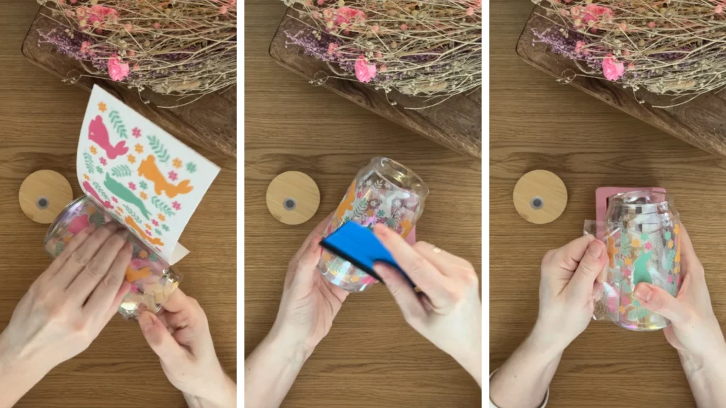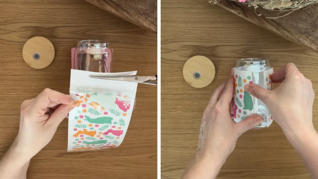 Amikor a helyén van, óvatosan fektesd le a pohárfólia szabadon lévő részét, az ujjaiddal nyomd rá és simítsd a mintát a pohárra.